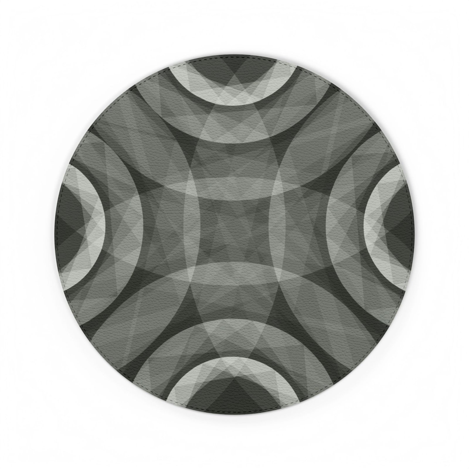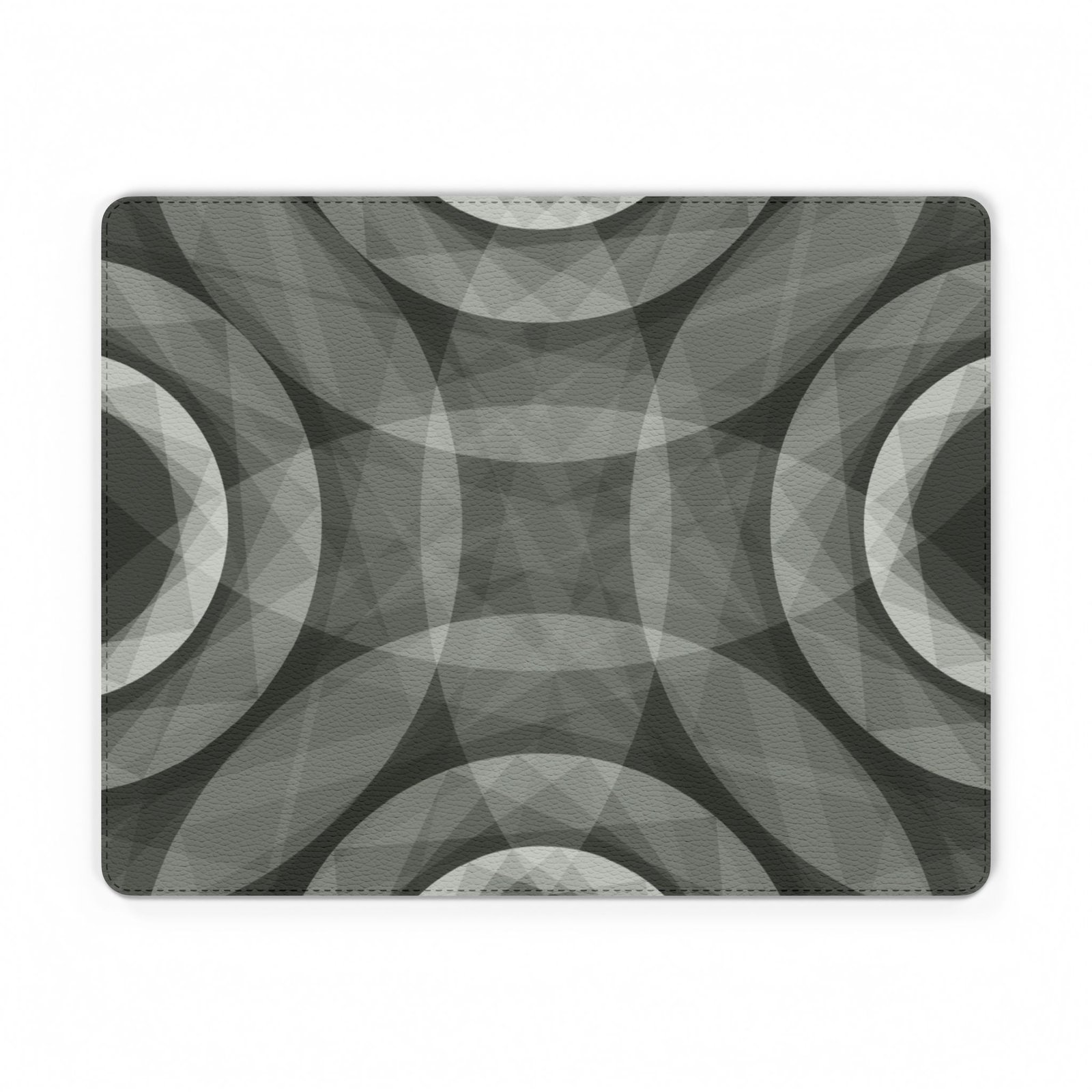 A sleek PU leather mouse mat with a muted geometric design that brings quiet sophistication to your desk. The soft, leather-like top has a subtle texture and layered circular pattern in grayscale, lending a modern, almost meditative vibe to work or creative sessions. The sturdy non-slip backing keeps the mat firmly in place, while eco-conscious inks preserve the depth of the print without harsh chemicals. It sits low and unobtrusive on your desk, inviting long hours of focused typing, browsing, or designing without distraction.