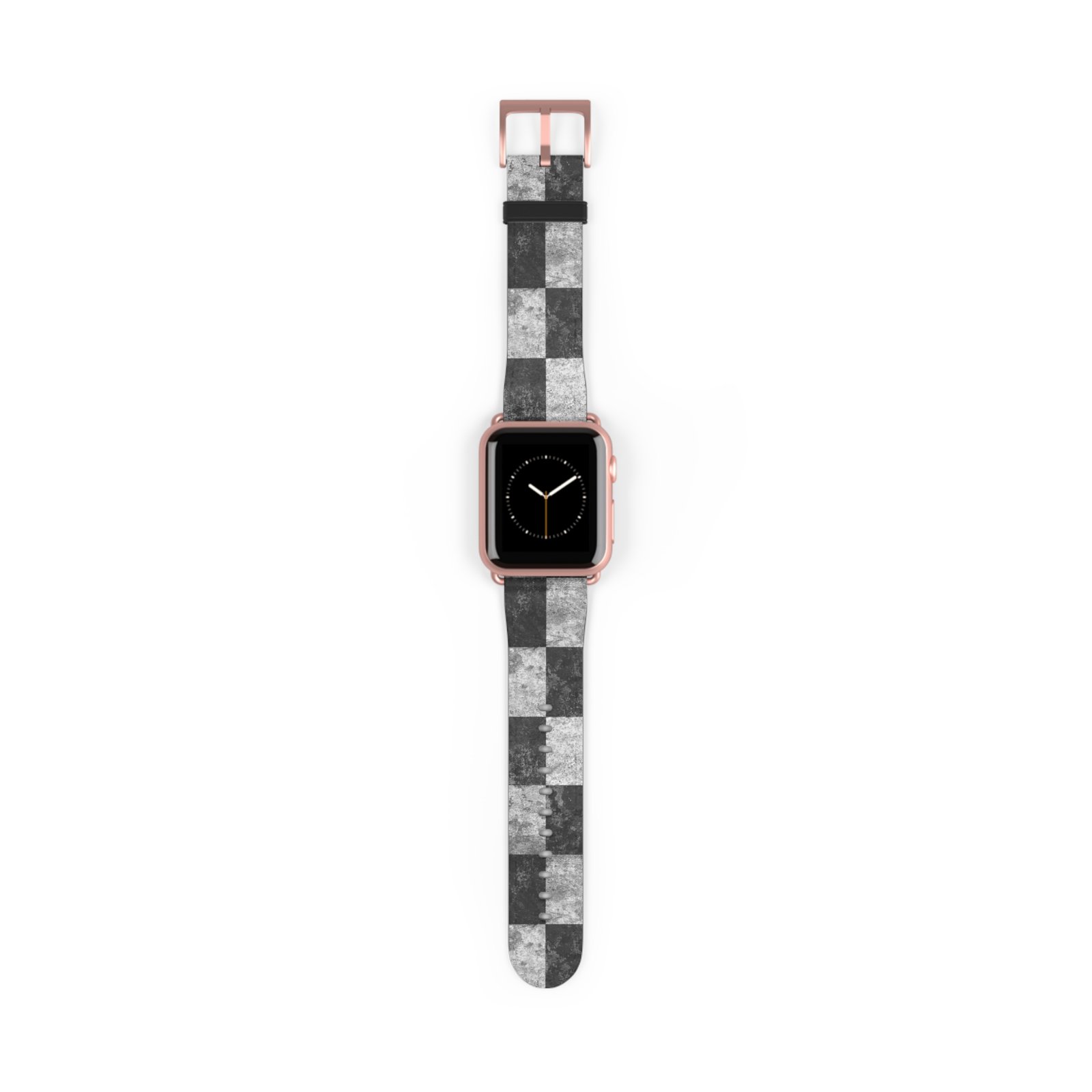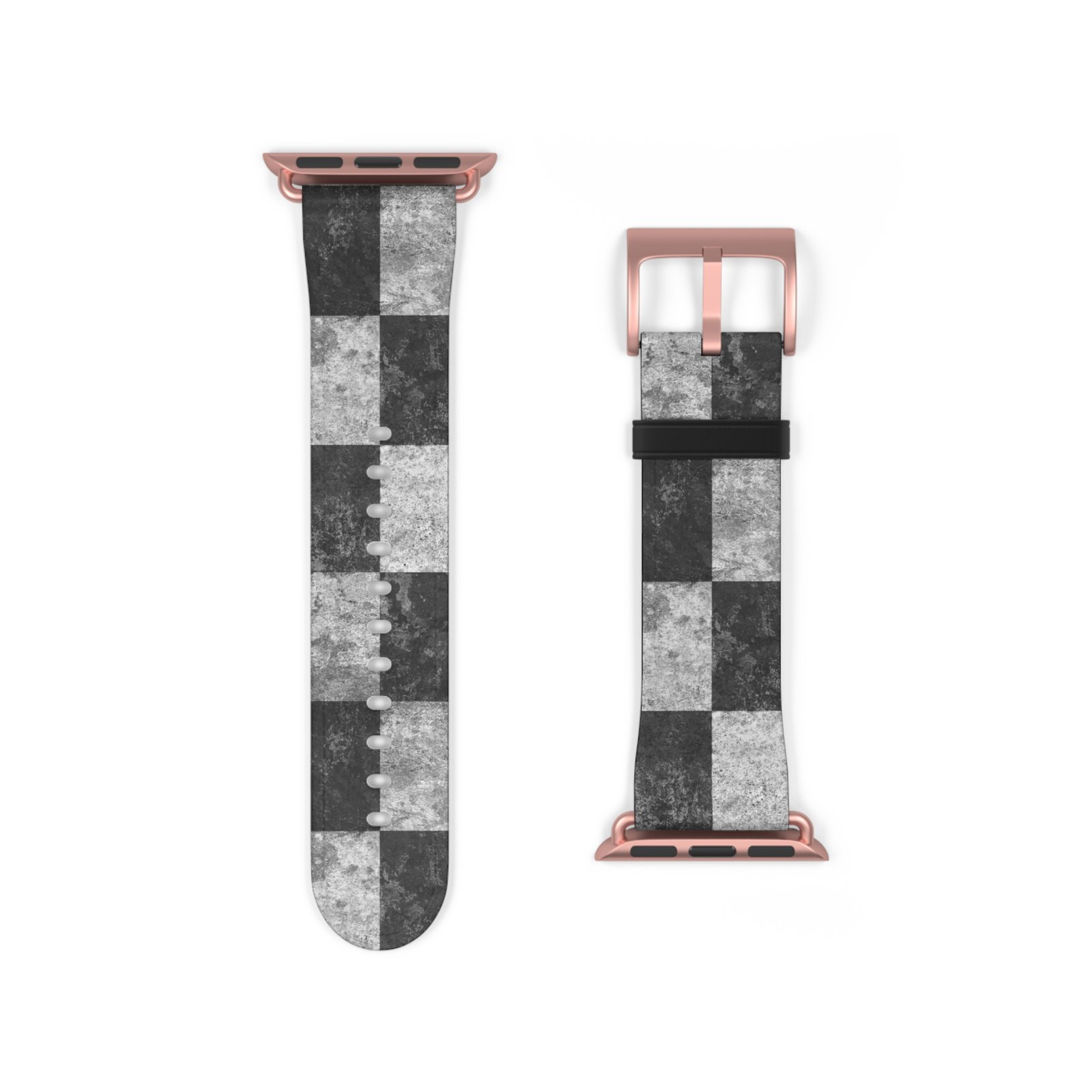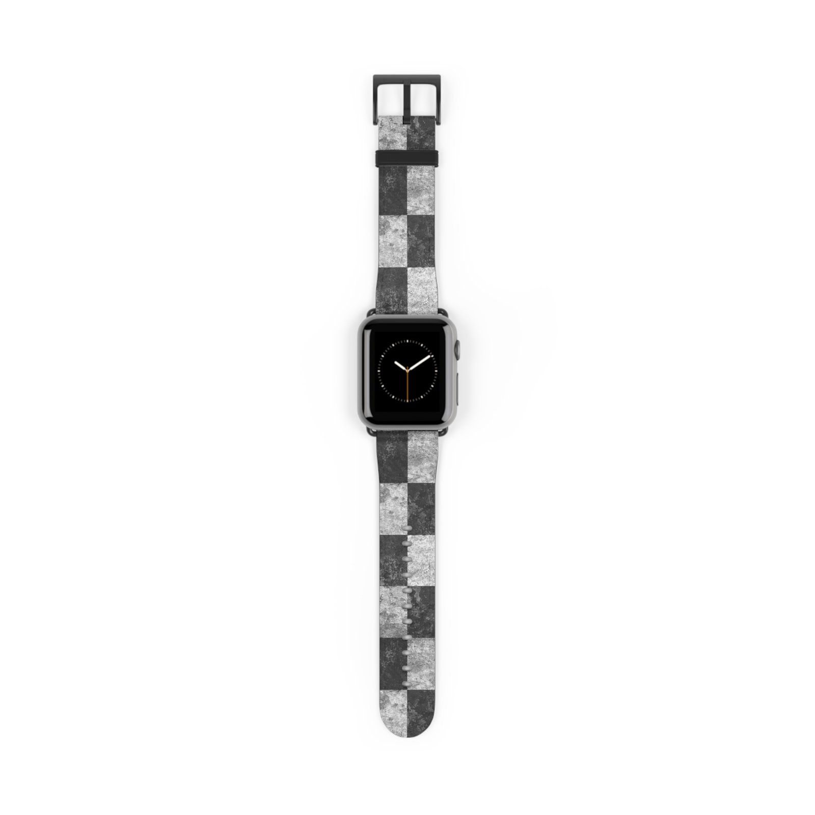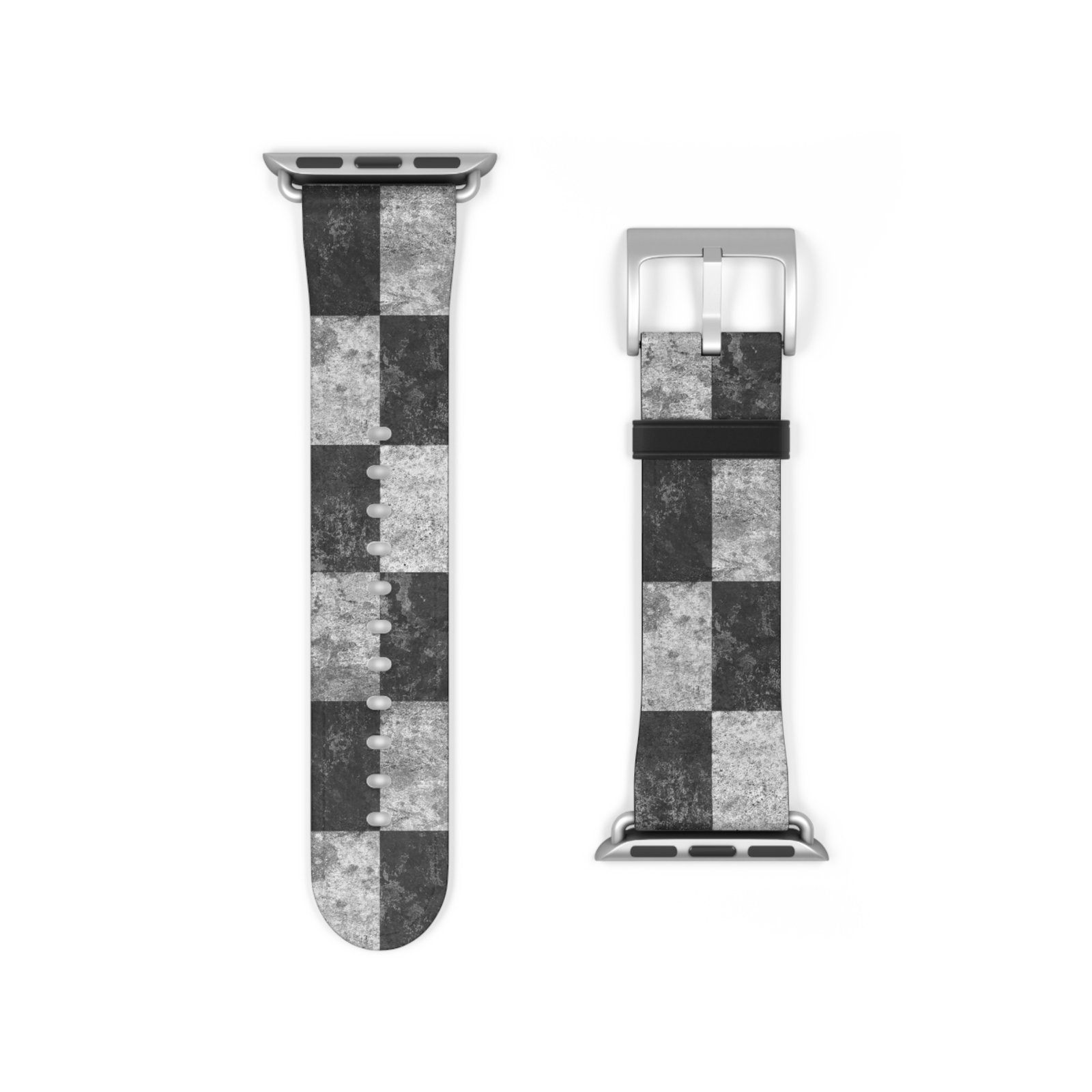 A sleek Apple Watch band with an artful grayscale checkered print that pairs modern minimalism with subtle texture. The faux-leather strap feels smooth against the skin while the stainless steel buckle and adapters give the band a solid, secure fit. Lightweight and compliant with international safety standards, this band slips onto Series 1–9, Ultra, and SE models to update your everyday watch with a refined, urban edge. Wear it to sharpen a casual outfit or to bring quiet pattern and contrast to a workday look.