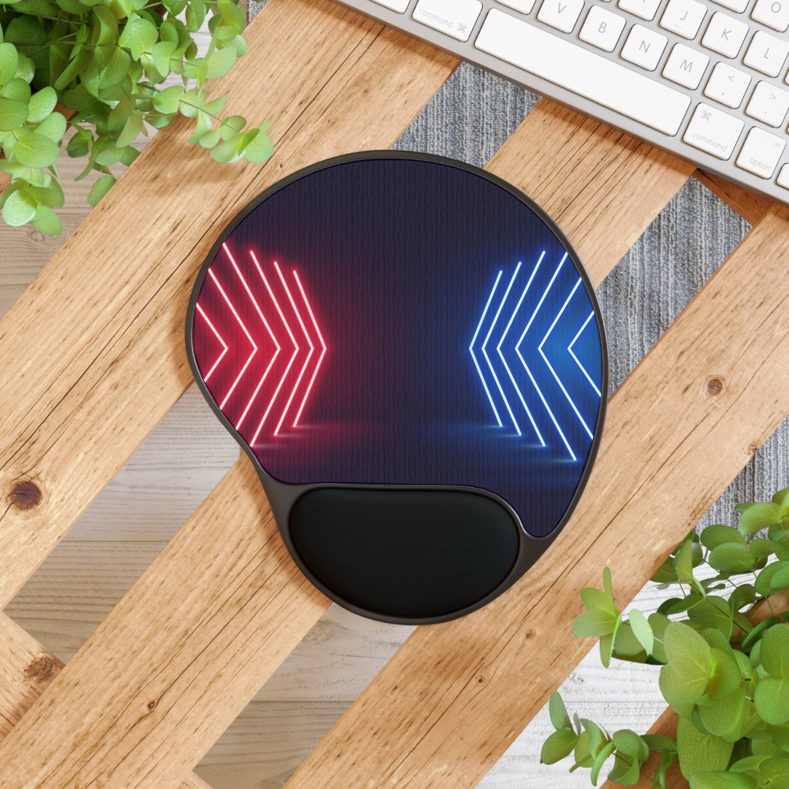 A sleek, ergonomic mouse pad that brings neon-lit energy to your desk while cushioning your wrist through long sessions. The vibrant, high-definition print captures electric red and blue chevrons fading into deep navy, creating a tunnel-like glow that feels modern and energized. The memory foam wrist rest supports your hand in natural alignment, and the removable neoprene insert makes cleaning quick and simple. Lightweight and compact, this pad settles neatly beside a laptop or monitor and gives your workspace an immediate style upgrade without getting in the way of productivity or play.
