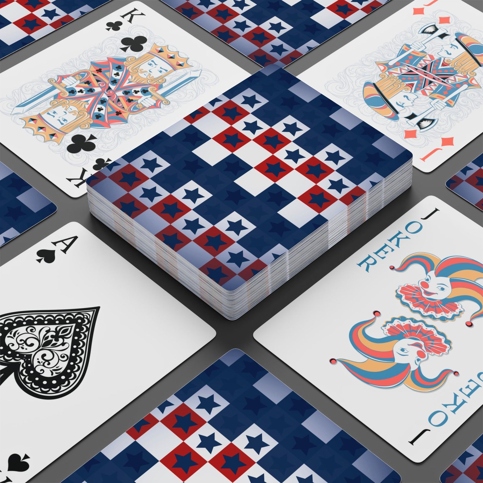 These poker playing cards bring color and confident craftsmanship to every hand. The deck’s vibrant back design — a bold red, white and blue checkerboard of stars — sets a lively tone before the first deal. Each card is printed on smooth 300 gsm premium-coated cardstock for a pleasant weight and glide, so shuffles feel clean and controlled and deals land exactly where you want them. The standard 52-card set plus two jokers fits familiar play styles, and each card’s back is fully printed to keep the design consistent throughout. Housed in a clear acrylic box, the deck sits ready on a shelf or table, easy to grab for game night, backyard barbecues, or a relaxed evening with friends. These cards are made for players who like tactile quality and a look that makes the whole table feel more festive and intentional.